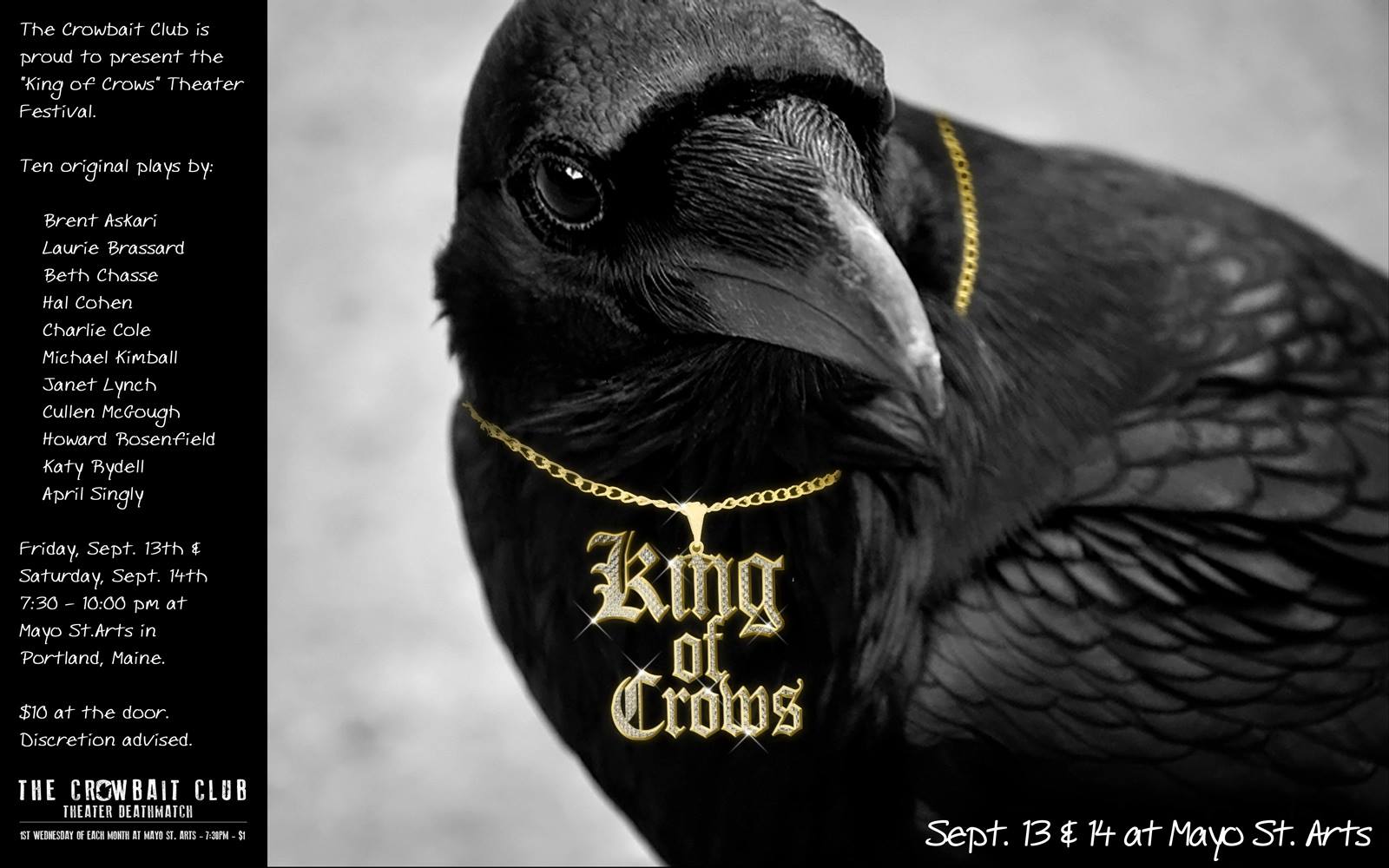 Also, Mike’s multi-award-winning short play Say No More! is one of eleven short plays—none more than 10 minutes long—comprising the “King of Crows” Short Play Festival: September 13-14 at Mayo Street Arts Center in Portland, ME, 7:30-10:00 p.m. $10 at the door.