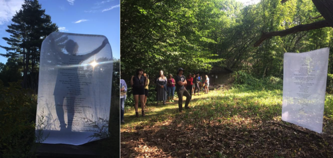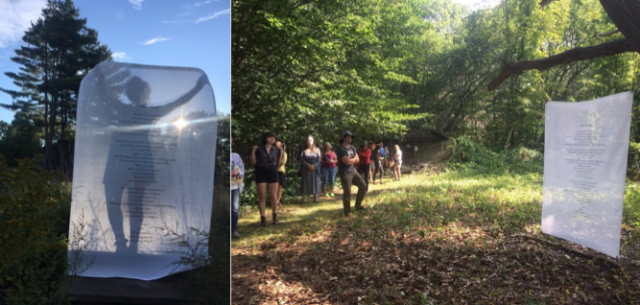 From August through October 2017, Jenny O’Connell‘s (Creative Nonfiction, S’17) short nonfiction poetry collection, “Home of Air,” was featured in Surface First Tilts West—an interactive outdoor art installation on Little Chebeague Island in Casco Bay, Maine. Curated by visual artist Jordan Kendall Parks, the exhibition was a multi-medium body of work that encouraged the audience to engage with each piece: crawling under a canvas and listening to a poem read aloud, sitting atop a bench with fabric inspired by traditional southern quilting that houses a poem regarding a relationship with “home,” listening to a recording along a trail, or climbing a giant oak tree and viewing a suspended reading.