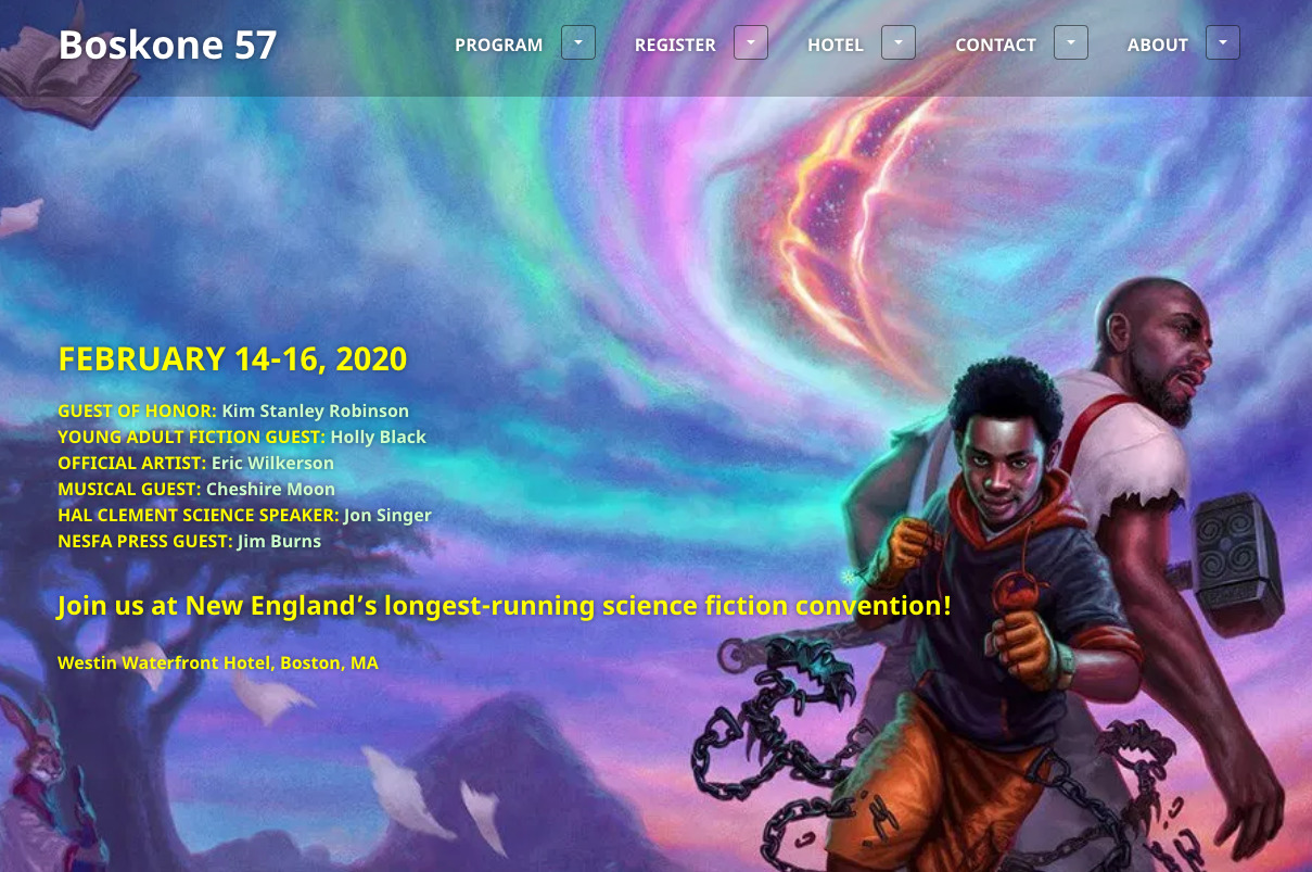 This year’s Boskone—New England’s longest running science fiction convention—features many Stonecoast faculty and alumni on the program participant list, including: KT Bryski (Popular Fiction, W’16), Julie C Day (Popular Fiction, S’12), David Anthony Durham (Fiction, Popular Fiction faculty), Theodora Goss (Popular Fiction faculty), James Patrick Kelly (Popular Fiction, Playwriting faculty), Mur Lafferty (Popular Fiction, W’14), Robert V. S. Redick (Popular Fiction faculty), Erin Roberts (Popular Fiction, W’18), and (of course!) Erin Underwood (Popular Fiction, S’09). Word is that many other Stonecoasters will be in attendance as well. Feel free to join us! Boskone – February 14th to 11th at the Westin Waterfront Hotel, Boston.