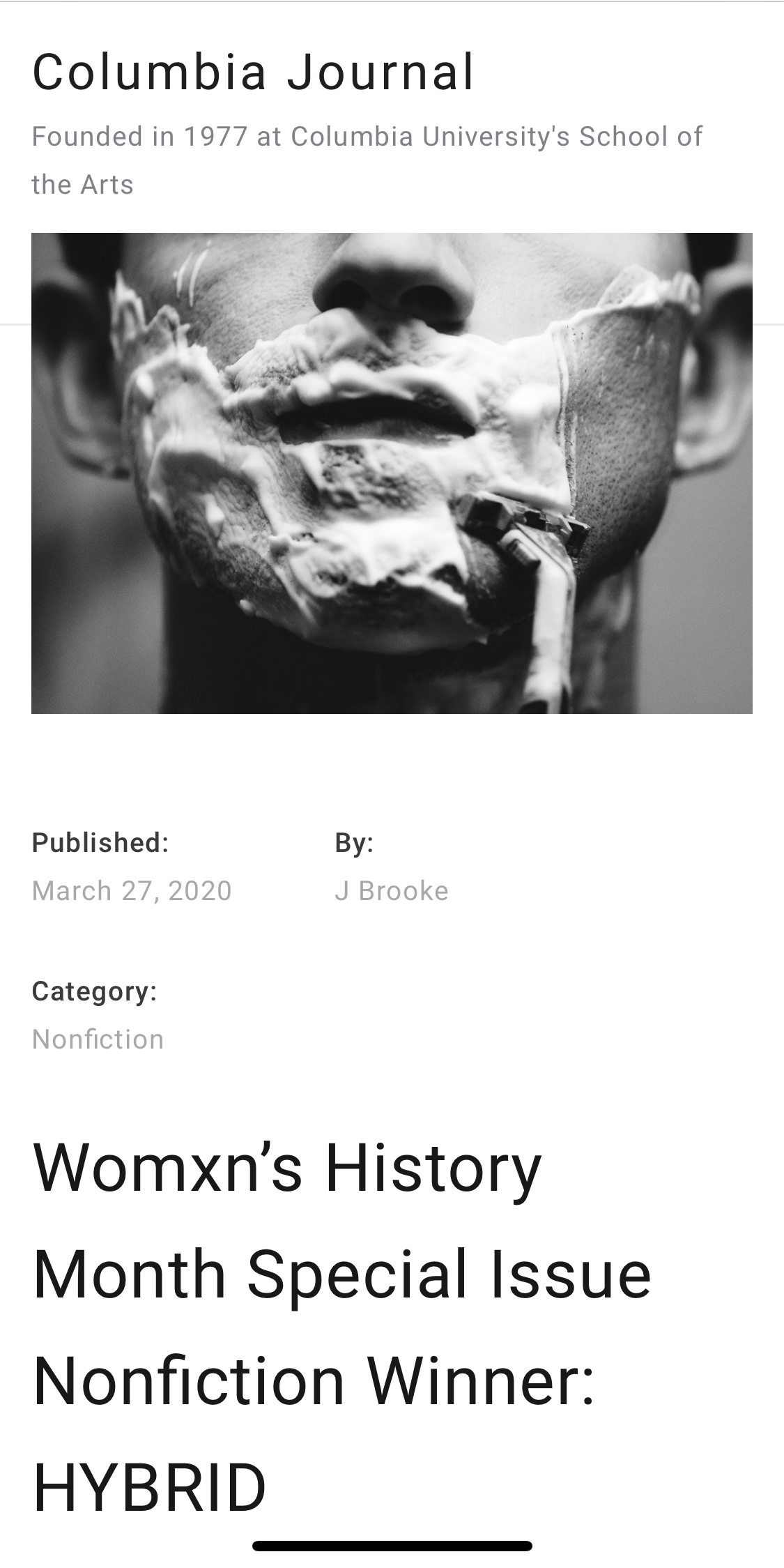 j brooke’s (Poetry, S’19) essay “Hybrid” was the Nonfiction Winner for Columbia Journal’s Womxn’s History Month Special Issue.