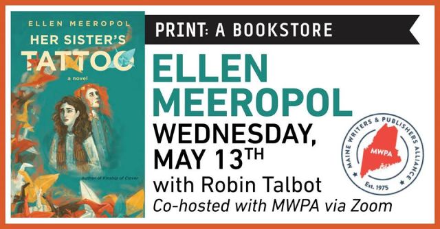 Ellen Meeropol (Fiction, W’06) and Robin Talbot (Stonecoast Associate Director) invite the Stonecoast community to a Virtual Book Event at PRINT Bookstore in Portland on May 13, 2020, at 7:00 pm. Co-hosted by Maine Writers and Publishers Alliance (MWPA) via Zoom, Ellen will read from her new novel, Her Sister’s Tattoo, and talk with Robin. To register, visit here or here.