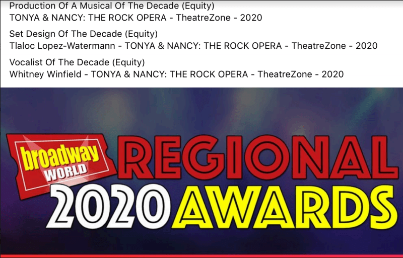 In Scriptwriting news, Elizabeth Searle’s (Fiction, Playwriting, Popular Fiction, Scriptwriting, Writing for Social Change) Tonya & Nancy: The Rock Opera just won four Broadway World Regional Theater awards for the 2020 TheatreZone production, starring Broadway’s Andrea McArdle. The awards are given by Broadway World for different regions of the USA. Tonya & Nancy won Best Production of the Decade of a Musical—for the Southeast Florida region—and also Best Director, Best Vocal Performance, and Best Setting Design. For updates, see www.tonyaandnancytherockopera.com