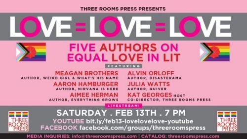 Aaron Hamburger (Fiction, Creative Nonfiction, Writing for Social Change) will be appearing on a special pre-Valentine’s Day panel called “Love = Love = Love: Five Authors on Equal Love in Lit,” sponsored by Three Rooms Press, on Saturday, February 13th, at 7:00 pm. The panel will be livestreamed on Facebook and YouTube. This lively discussion of equal love in literature by five award-winning LGBTQ authors—including, in addition to Aaron, Meagan Brothers, author, Weird Girl and What’s His Name; Aimee Herman, author, Everything Grows; Alvin Orloff, author, Disasterama; and Julia Watts, author, Quiver. Kat Georges, co-director of Three Rooms Press, will host. The discussion will explore: How love in literature has become more inclusive during recent decades; How each author addresses love in their writing and opens doors to acceptance of love without boundaries; Why literature can provide inspiration in times of loneliness and heartbreak; Different levels of love: from friendship to red-hot lust. Following the discussion, the authors will field questions from the livestream audience.