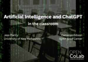 Cameron Gibson (Popular Fiction, W’18) and Jess Flarity (Popular Fiction, S’18) collaborated in a presentation on ChatGPT in the Classroom for Plymouth State University’s OpenLab. You can watch them nerd out on language software here.