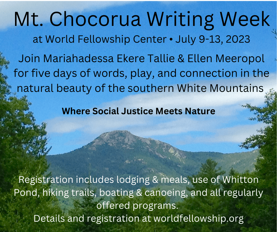 Ellen Meeropol (Fiction, W’06) is co-facilitating a writing week in the southern White Mountains with poet Ekere Tallie. World Fellowship Center is a glorious place to write and read and hike and swim. Details here.