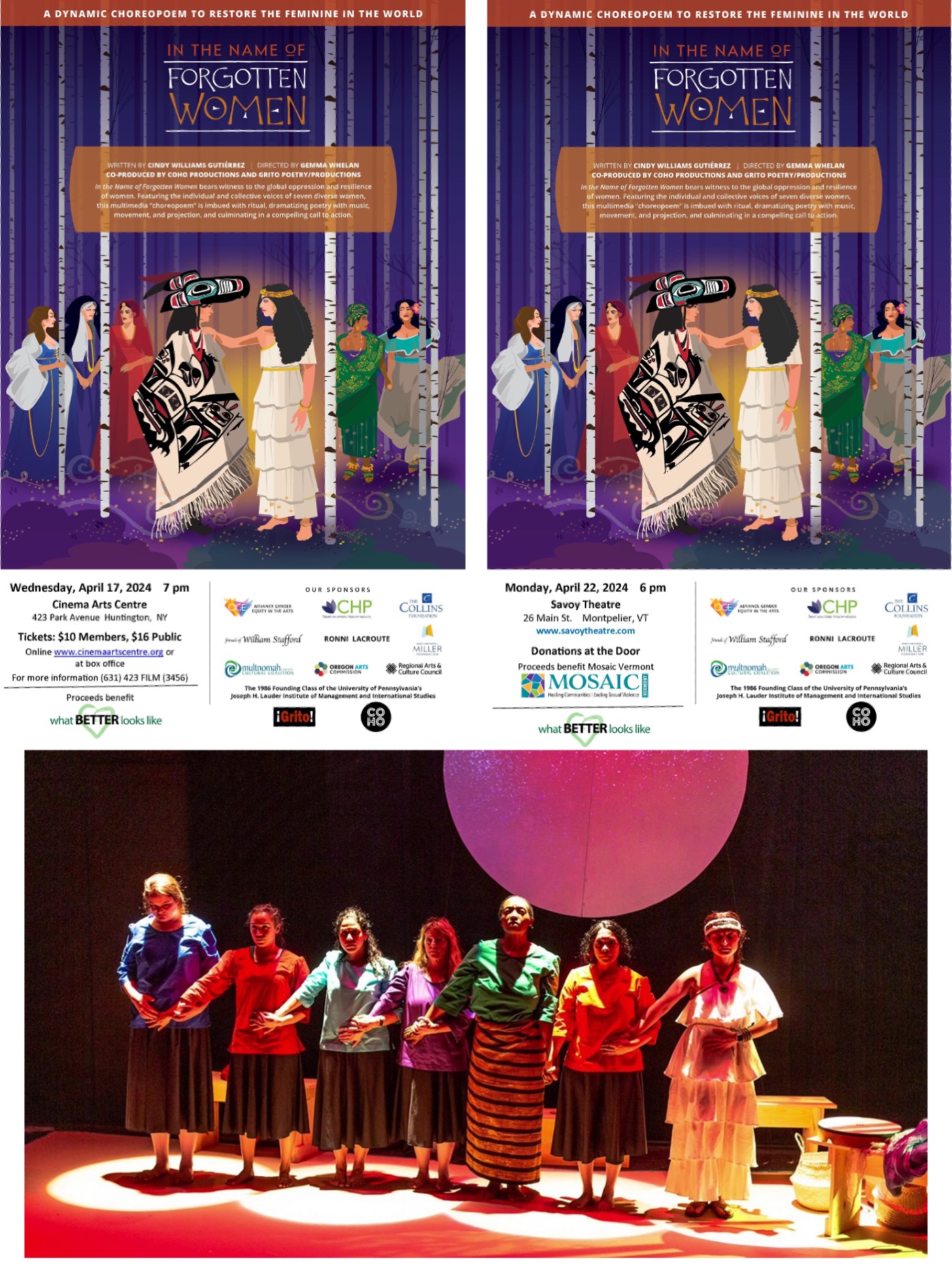Cindy Williams Gutiérrez’s (Poetry/Drama, W’08) choreopoem In the Name of Forgotten Women will be screened on Wednesday, April 17th, at 7:00 p.m. at the Cinema Arts Centre in Huntington, New York (423 Park Avenue), and on Monday, April 22nd, at 6:00 p.m. at the Savoy Theatre in Montpelier, Vermont (26 Main St.). Proceeds benefit What BETTER Looks Like and Mosaic Vermont, respectively.