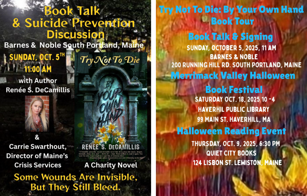 Renée S. DeCamillis, (Popular Fiction, W’14) is excited to announce three book events for October 2025 for her latest release, Try Not to Die: By Your Own Hand, an interactive novel about suicide ideation and prevention. This is a charity novel, with all profits donated to Maine’s Mobile Crisis Hotline run by The Opportunity Alliance.
